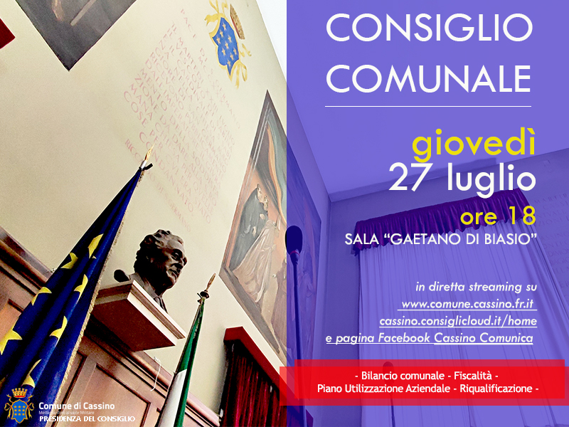 Si terrà giovedì 27 luglio, a partire dalle ore 18:00, il Consiglio Comunale di Cassino, convocato nella sala "Gaetano Di Biasio” in seduta ordinaria di prima convocazione.