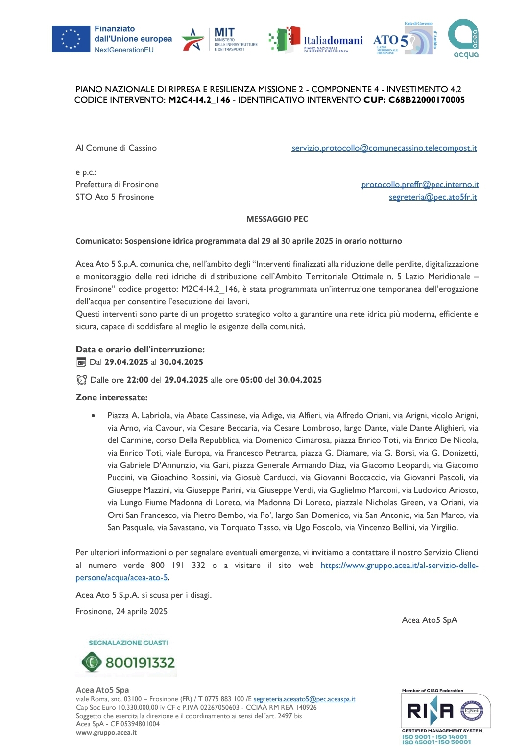 Acea Ato5, gestore della rete idrica cittadina, ha informato il Comune che nella notte tra 29 e 30 aprile, per "interventi finalizzati alla riduzione delle perdite, è stata programmata un'interruzione temporanea dell'erogazione dell'acqua".