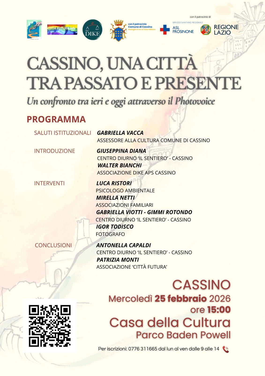 Mercoledì 25 febbraio 2026, alle ore 15:00, presso la Casa della Cultura – Parco Baden Powell, si terrà l’incontro pubblico dal titolo “Cassino, una città tra passato e presente”, un momento di confronto e riflessione che utilizza la metodologia del Photovoice per raccontare l’evoluzione della città attraverso immagini e testimonianze. L’iniziativa è realizzata dall'associazione Dike e Città Futura, dal Centro Diurno di Cassino ASL Frosinone e dal Comune di Cassino.