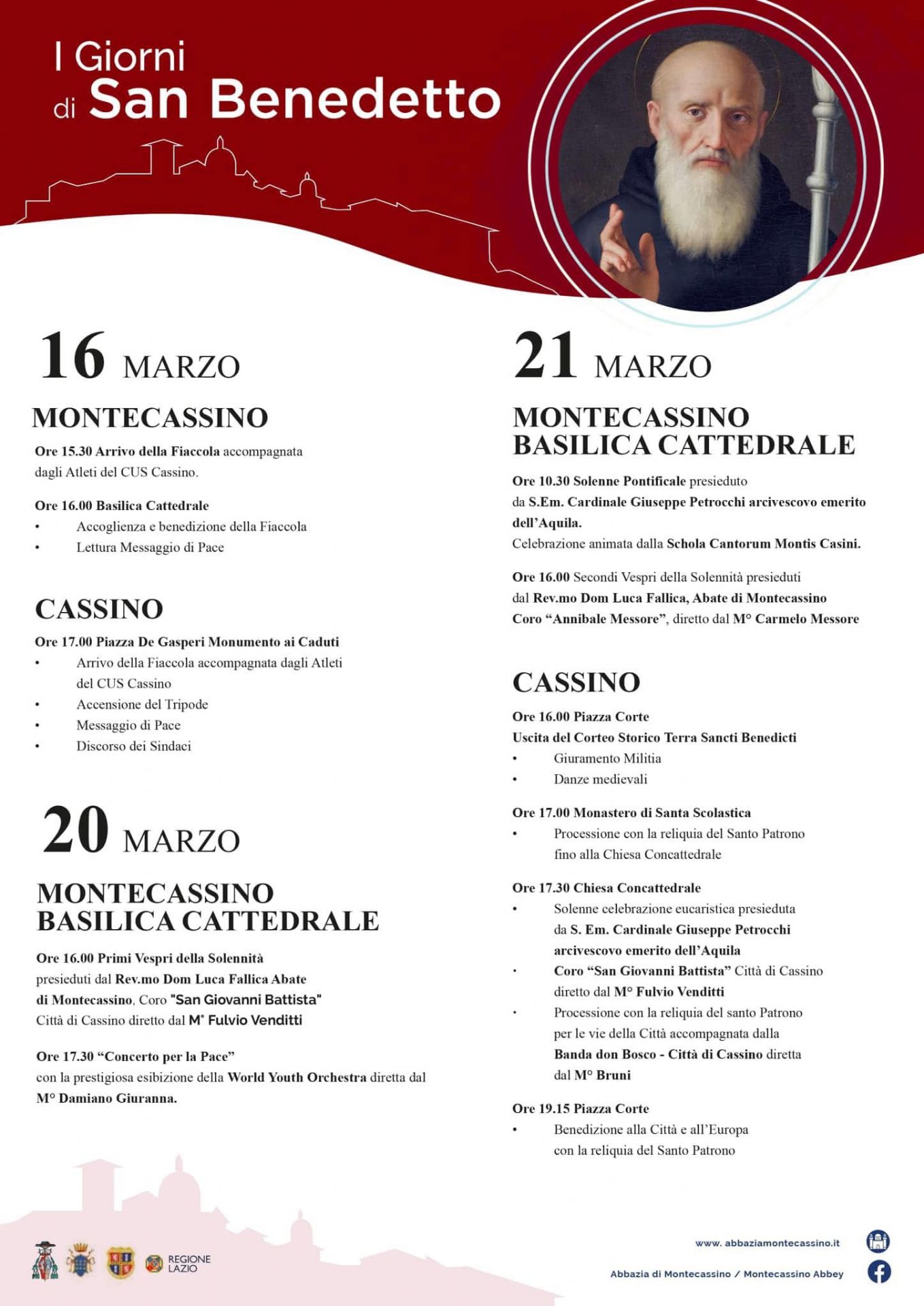 Il 20 marzo, presso la Basilica Concattedrale di Montecassino, i Vespri della Solennità con l'Abate Luca Fallica, il Coro di San Giovanni Battista-Città di Cassino. Alle 17,30, il Concerto per la Pace con la World Youth Orchestra.