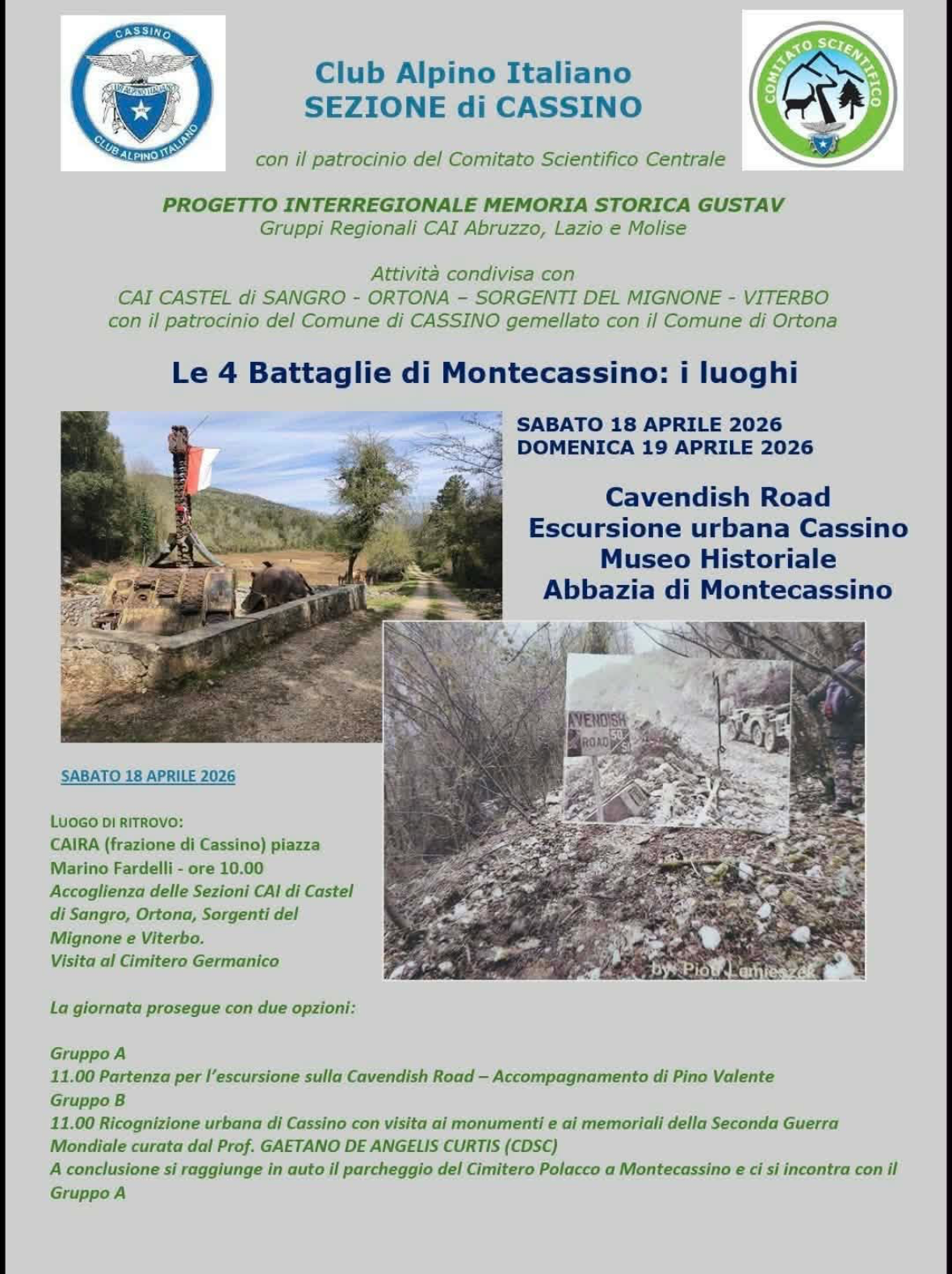 Il Club Alpino Italiano – Sezione di Cassino organizza, per il 18 e 19 aprile 2026, l’iniziativa “Le 4 Battaglie di Montecassino: i luoghi”, dedicata alla memoria storica della Seconda Guerra Mondiale.