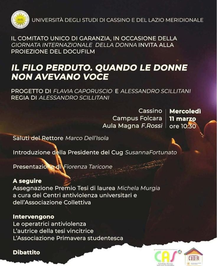In occasione della Giornata Internazionale della Donna, l’Università degli Studi di Cassino e del Lazio Meridionale, attraverso il Comitato Unico di Garanzia (CUG), promuove la proiezione del docufilm “Il filo perduto. Quando le donne non avevano voce”, progetto di Flavia Caporuscio e Alessandro Scillitani, con la regia di Alessandro Scillitani.