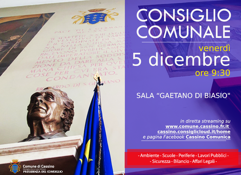 e' stata convocata per domani, venerdì 5 dicembre, a partire dalle ore 9,30, la seduta del consiglio comunale di cassino.