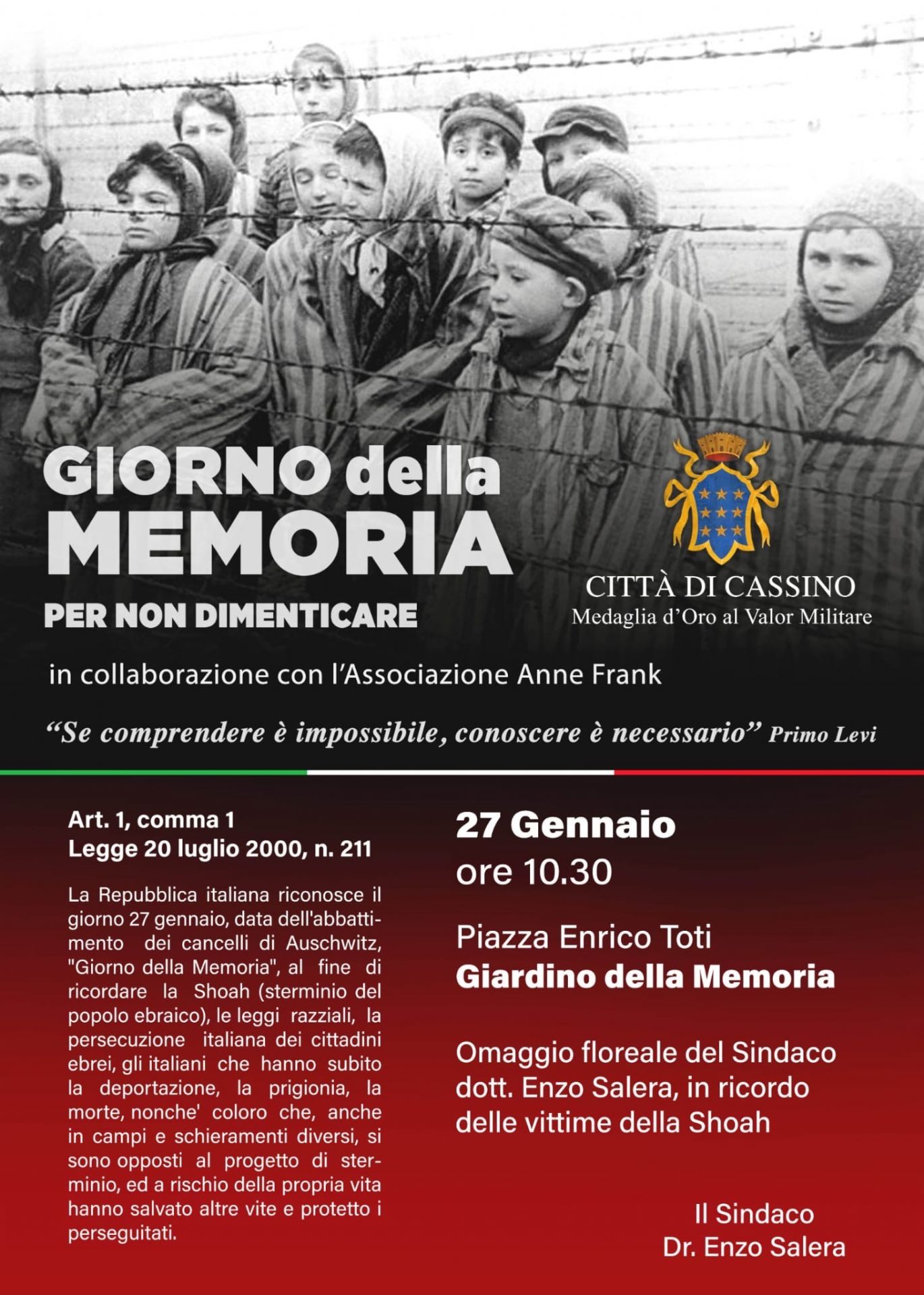 Martedì 27 gennaio alle ore 10:30 presso il Giardino della Memoria in Piazza Enrico Toti, in collaborazione con l'Associazione Anne Frank, il Comune di Cassino renderà omaggio alle vittime della Shoah, alla presenza del Sindaco di Cassino dott. Enzo Salera, ed i rappresentanti del Consiglio Comunale e della Giunta.