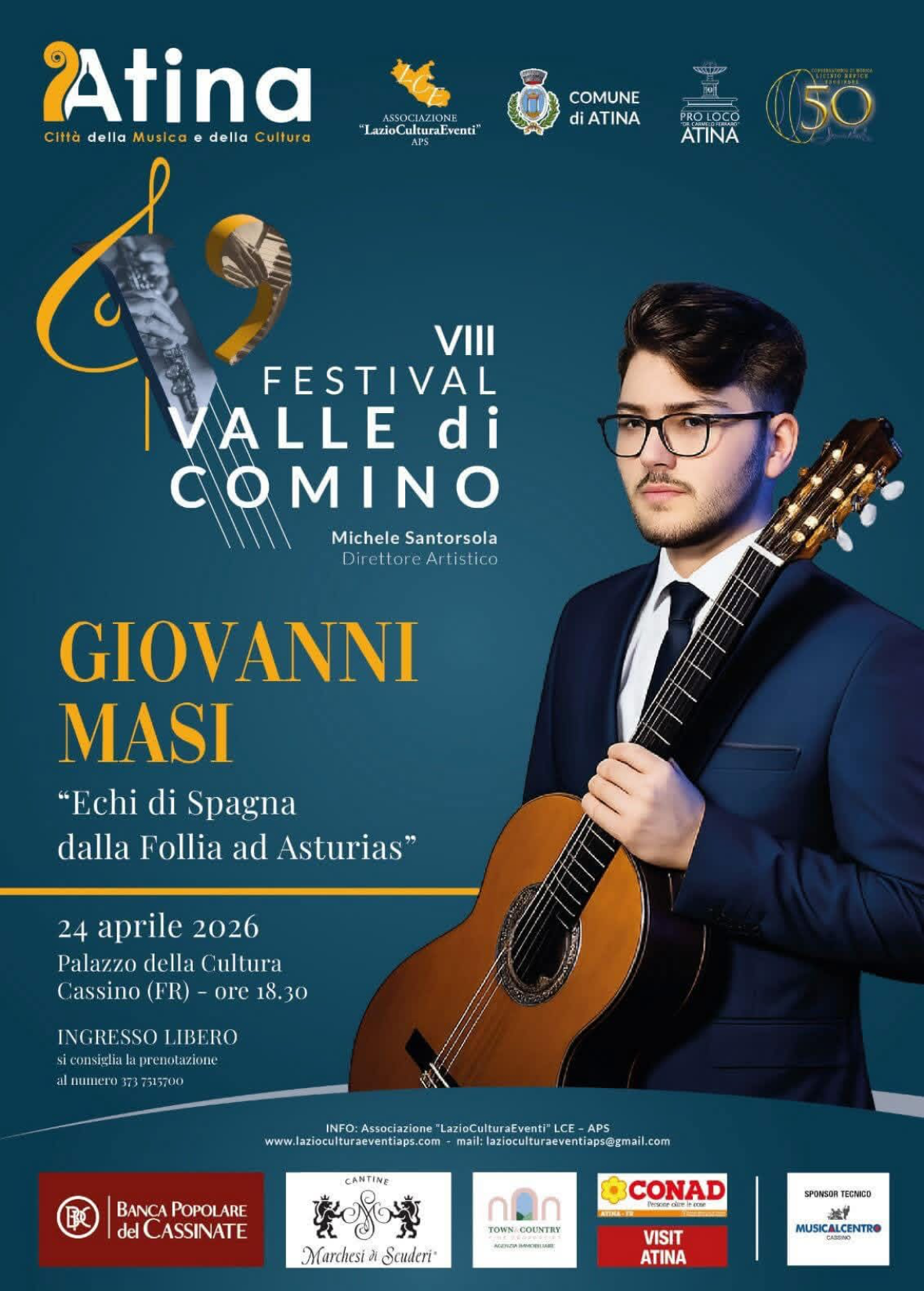 Il 24 aprile 2026 alle ore 18:30, presso il Palazzo della Cultura, si terrà il recital del chitarrista Giovanni Masi dal titolo “Echi di Spagna: dalla Follia ad Asturias”.