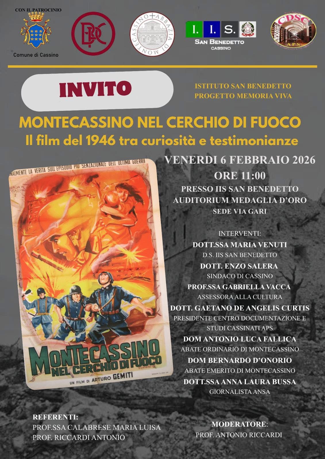 Venerdì 6 Febbraio alle ore 11:00, presso l'auditorium dell'IIS San Benedetto - Medaglia d'oro di Via Gari, si terrà un incontro pubblico con discussione sul film "Montecassino nel cerchio di fuoco".