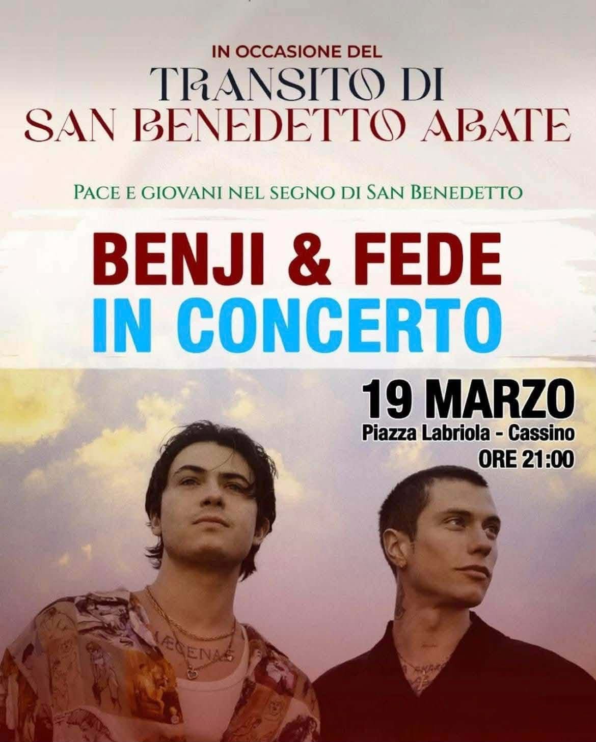 In occasione dei festeggiamenti per San Benedetto giovedì 19 marzo 2026, alle ore 21:00, nella centralissima Piazza Labriola, si terrà uno degli appuntamenti più attesi del programma: il concerto di Benji & Fede.
