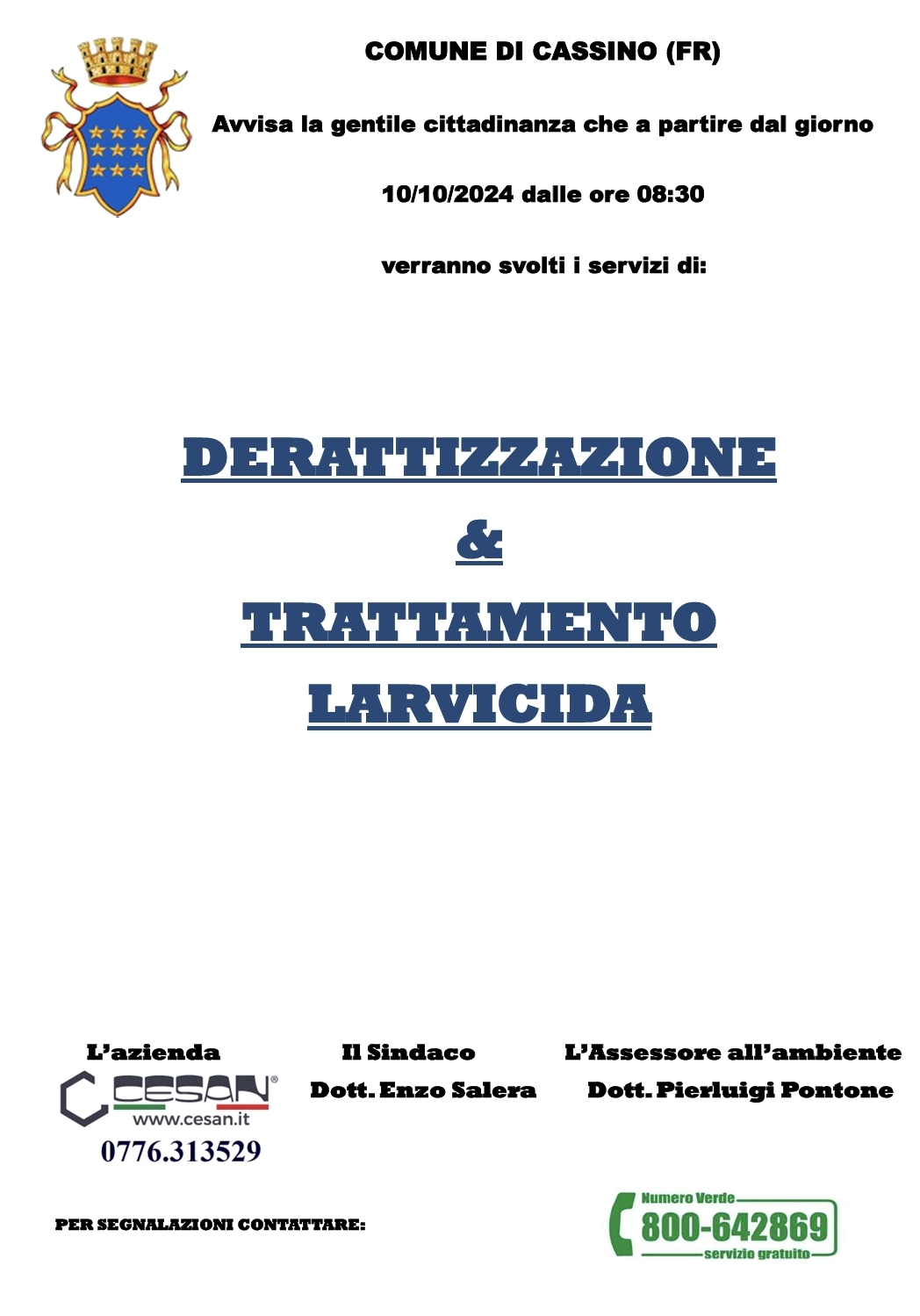 L'ufficio Ambiente comunica che a partire dalle ore 8.30 del giorno 10 ottobre 2024, verrà effettuata attività di derattizzazione e trattamento larvicida.