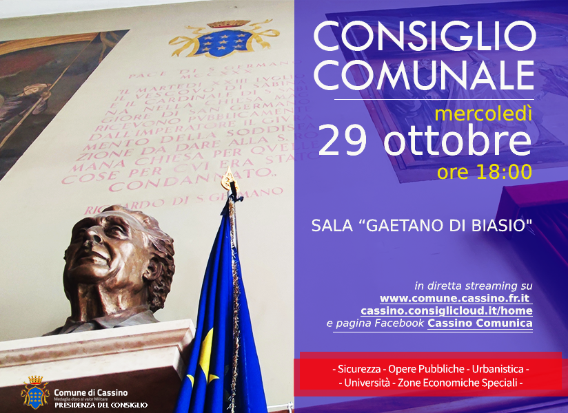 É stata convocata per mercoledì 29 ottobre, a partire dalle ore 18, la seduta del prossimo Consiglio Comunale di Cassino.