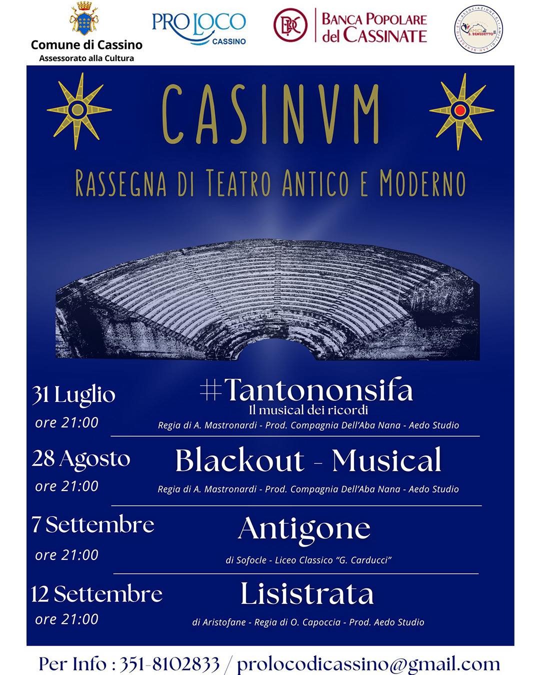 si parte il 31 luglio con "#tantononsifa", poi il 28 agosto con "Blackout - Musical", il 7 settembre con "Antigone" e si chiude il 12 settembre con "Lisistrata", offrendo al pubblico un'esperienza culturale che spazia dal teatro contemporaneo ai grandi classici della tradizione greca.