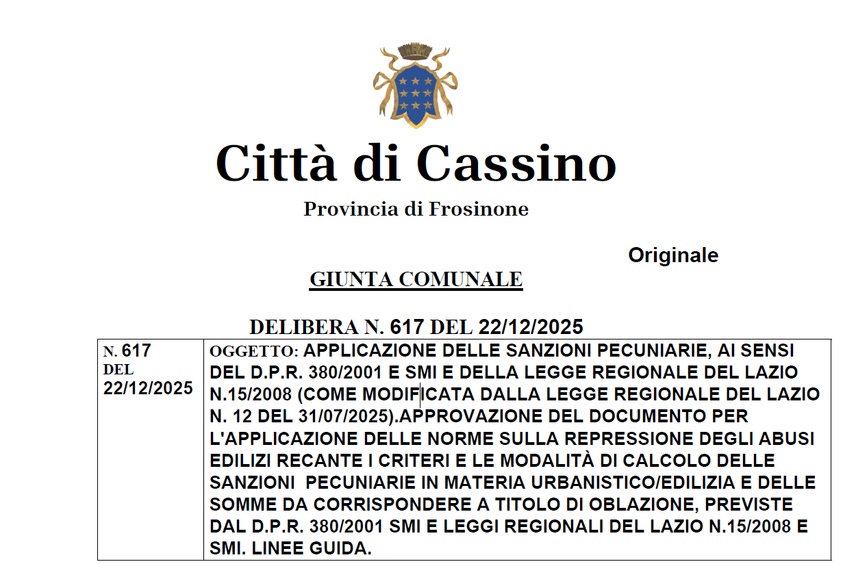 applicazione delle sanzioni pecuniarie, ai sensi del D.P.R. 380/2001 e smi e della L.R del Lazio n.15/2008 (come modificata dalla legge regionale del lazio n. 12 del 31/07/2025). Approvazione del documento per l'applicazione delle norme sulla repressione degli abusi edilizi recante i criteri e le modalità di calcolo delle sanzioni pecuniarie in materia urbanistico/edilizia e delle somme da corrispondere a titolo di oblazione, previste dal D.P.R. 380/2001 smi e Leggi Regionali del Lazio n.15/2008 e smi.
