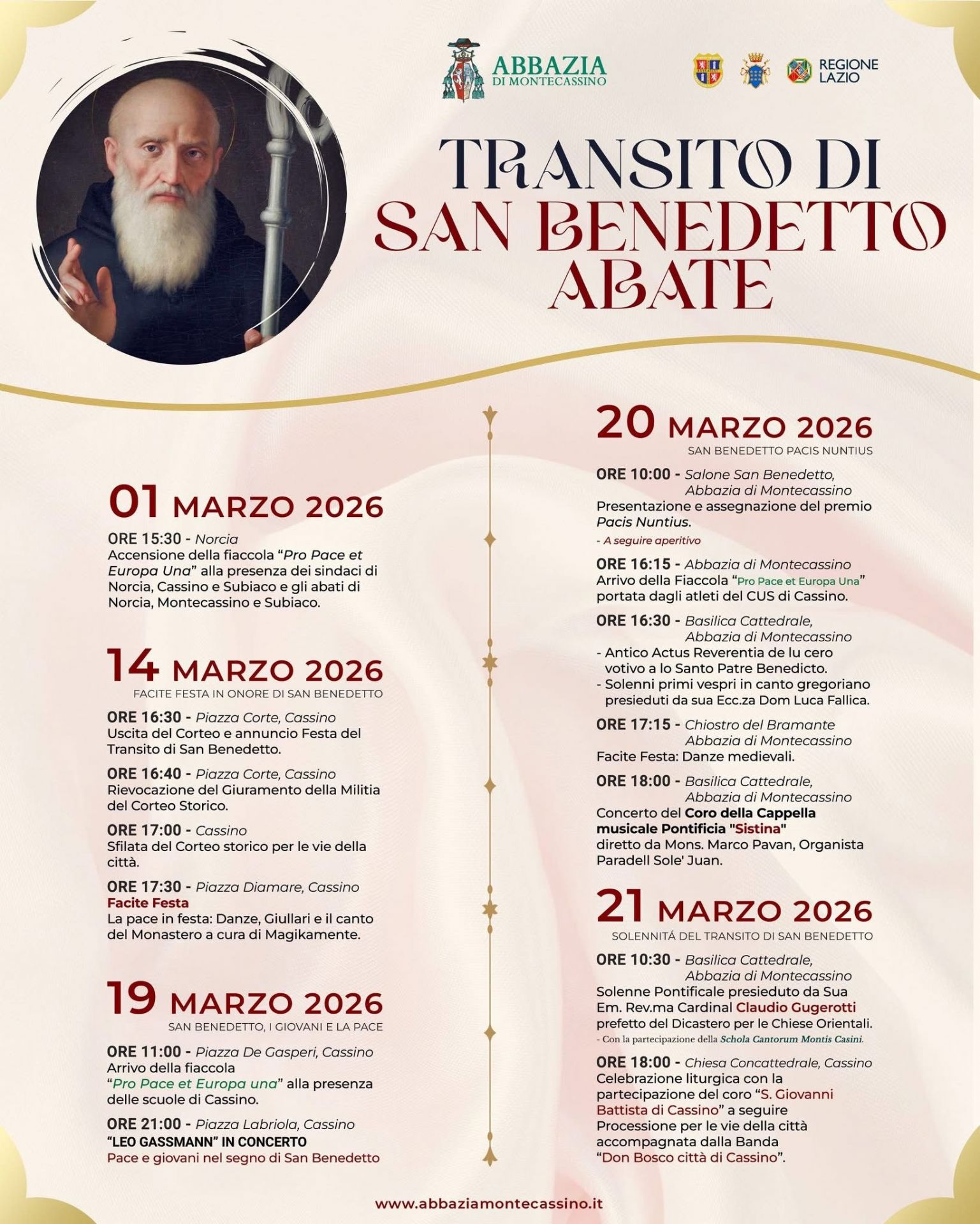 La città di Cassino, insieme all’Abbazia di Montecassino, si appresta a vivere uno dei momenti più significativi dell’anno civile, spirituale e culturale del territorio: il Transito di San Benedetto, patrono d’Europa.