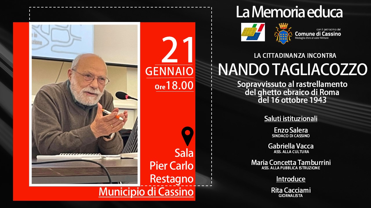 Un doppio incontro imperdibile con Nando Tagliacozzo, uno dei pochi scampati al rastrellamento del ghetto di Roma nell'ottobre del 1943, che il 21 gennaio, prima all'IIS Medaglia d'Oro, poi al Comune di Cassino, in Sala Restagno, terrà un incontro pubblico dal titolo "La Memoria Educa".