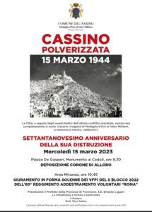 Il 15 marzo 2023 si terrà la cerimonia commemorativa del 79esimo Anniversario della distruzione della Città di Cassino e della Cerimonia di Giuramento in forma solenne dei VFP1 del 2° Blocco 2022 dell’80° Reggimento Addestramento Volontari “Roma”, in Piazza Benedetto XVI (Ex Campo Miranda).