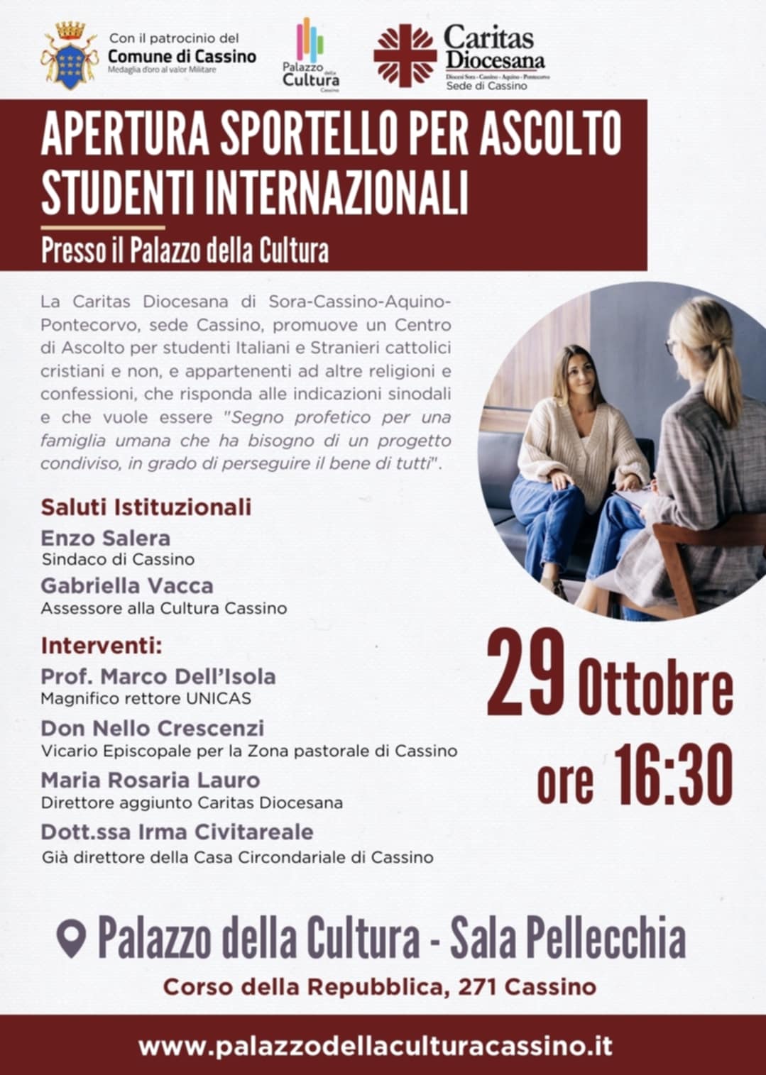Al Palazzo della Cultura, nella sala dedicata al compianto prof. Fausto Pellecchia, si terrà, mercoledì 29 ottobre, alle ore 16,30, l'inaugurazione dello sportello per l'ascolto degli studenti internazionali.