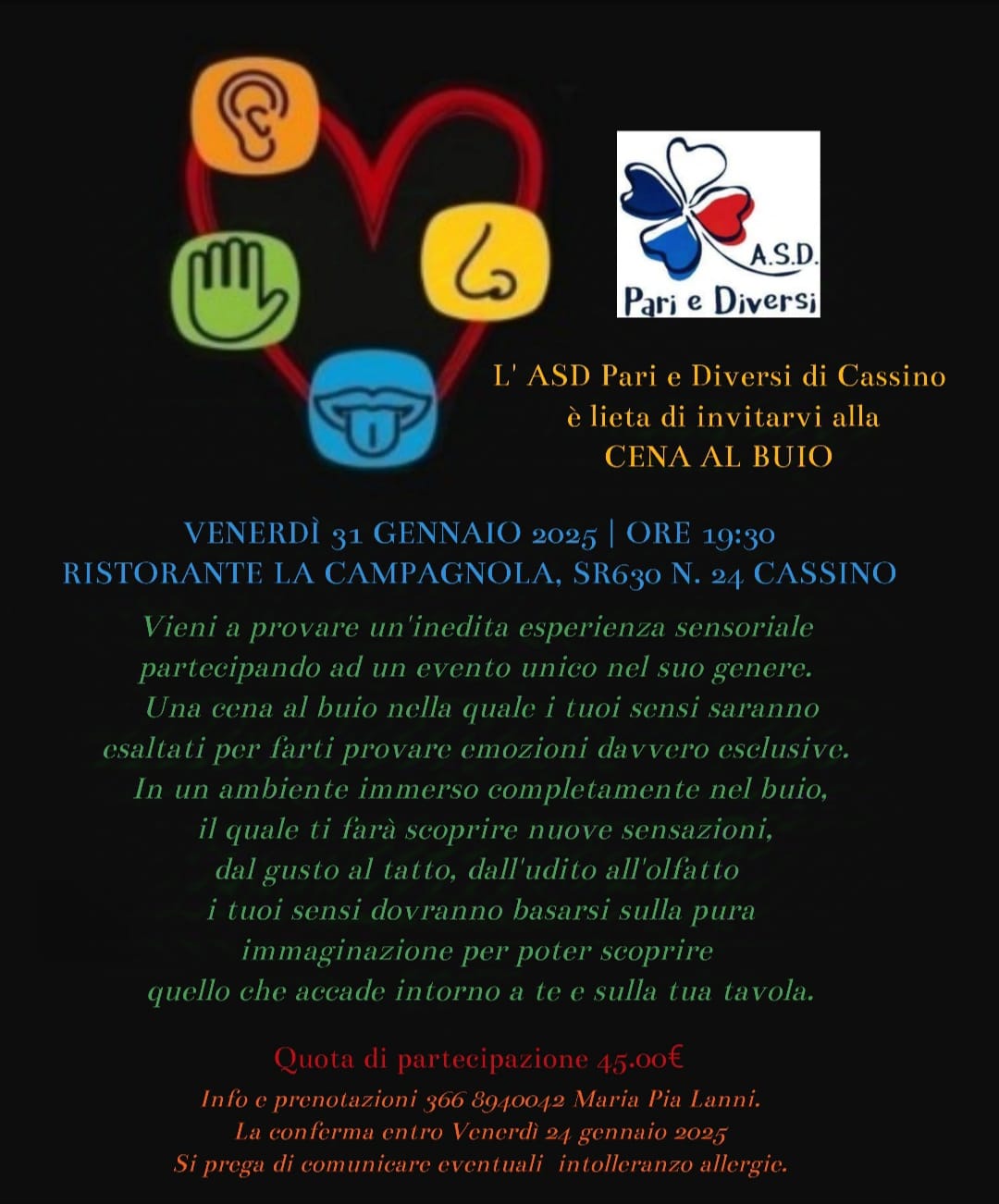Appuntamento al ristorante la Campagnola, il 31 gennaio, alle 19,30 per la Cena al buio organizzata dalla asd "Pari e Diversi".