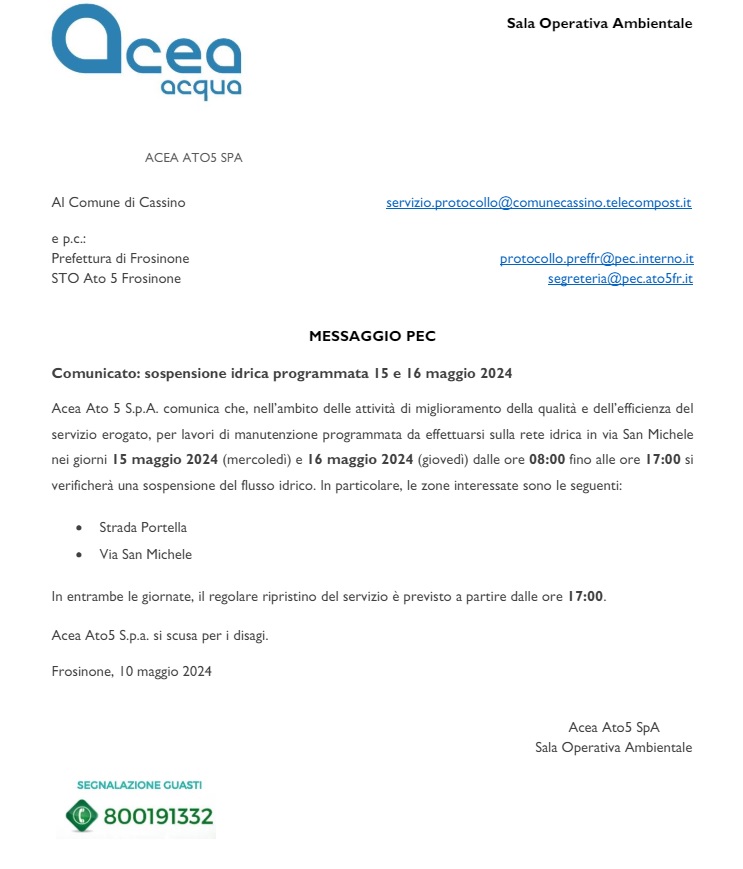 Acea Ato 5 S.p.A. informa che, a causa di un guasto improvviso presso l'impianto Serbatoio Piccolo, nel comune di Cassino, si sta verificando una sospensione del flusso idrico. In particolare, le zone interessate