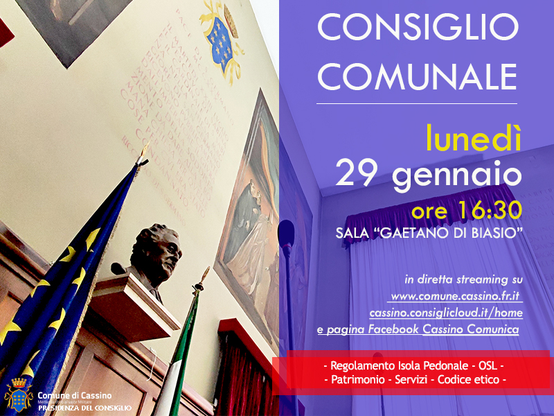 É stata convocata per lunedì 29 gennaio, a partire dalle ore 16:30, la seduta del Consiglio Comunale di Cassino.