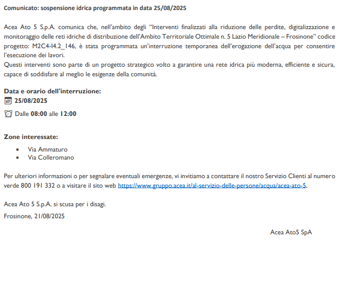 Acea Ato 5 S.p.A. ha informato il Comune che, nell’ambito degli “interventi finalizzati alla riduzione delle perdite, digitalizzazione e monitoraggio delle reti idriche di distribuzione dell’Ambito Territoriale Ottimale n. 5 Lazio Meridionale – Frosinone, è stata programmata un’interruzione temporanea dell’erogazione dell’acqua per consentire l’esecuzione dei lavori".