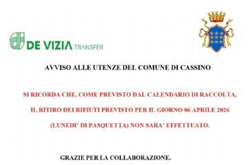 Raccolta differenziata, avviso alle utenze: si comunica che, come da calendario, lunedì 6 aprile non sarà effettuato il ritiro dei...