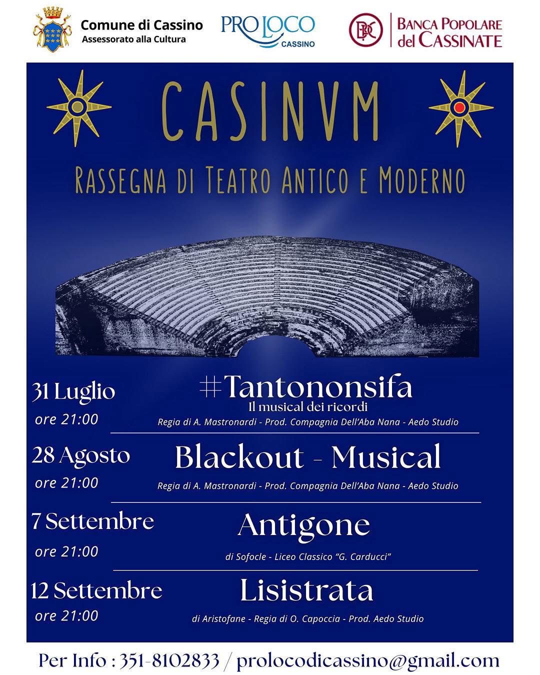 Dal 31 luglio al 12 settembre, al Teatro Romano, va in scena "Casinum", rassegna di teatro antico e moderno organizzata dalla Pro.Loco.