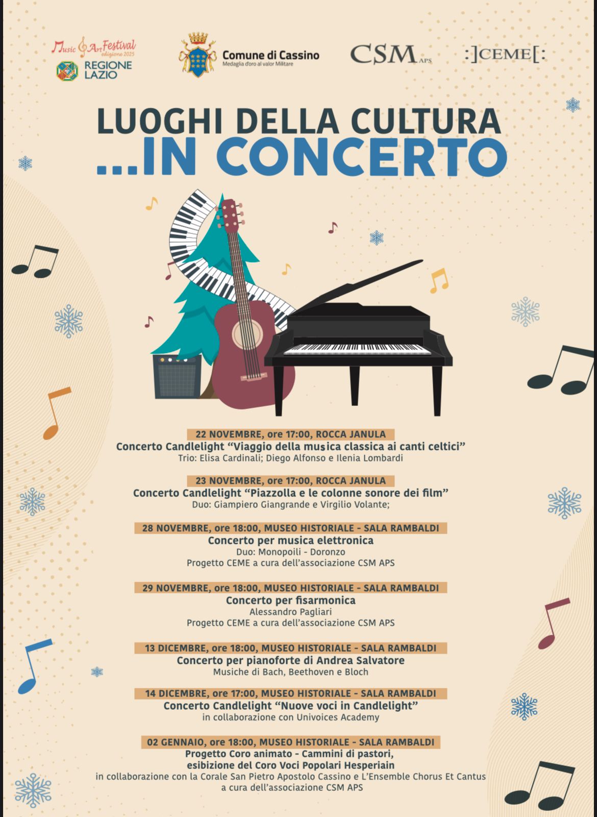 Una rassegna musicale, scandita da tre concerti "candelight" eseguiti a lume di candela, frutto della collaborazione tra Comune di Cassino, Regione Lazio, associazione CSM e progetto CEME, con la partecipazione di Univoices Academy, la Corale di S.Pietro di Cassino, l'Ensemble Chorus et Cantus e tanti artisti locali (e non solo).