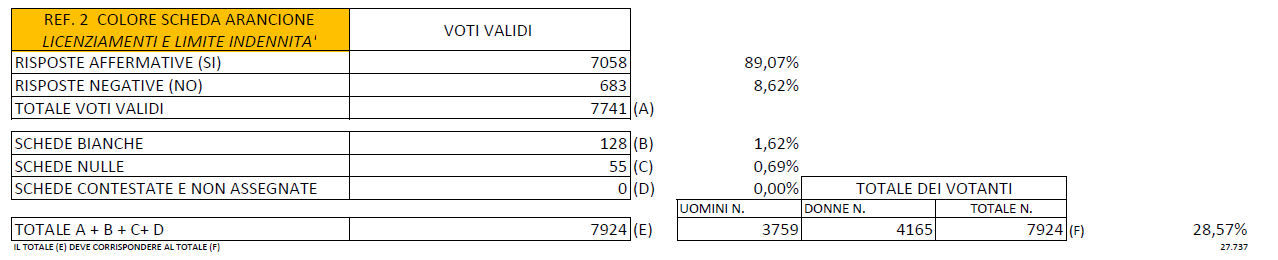 «Volete voi l’abrogazione dell’articolo 8 della legge 15 luglio 1966, n. 604, recante “Norme sui licenziamenti individuali”, come sostituito dall’art. 2, comma 3, della legge 11 maggio 1990, n. 108, limitatamente alle parole: “compreso tra un”, alle parole “ed un massimo di 6” e alle parole “La misura massima della predetta indennità può essere maggiorata fino a 10 mensilità per il prestatore di lavoro con anzianità superiore ai dieci anni e fino a 14 mensilità per il prestatore di lavoro con anzianità superiore ai venti anni, se dipendenti da datore di lavoro che occupa più di quindici prestatori di lavoro.”?»