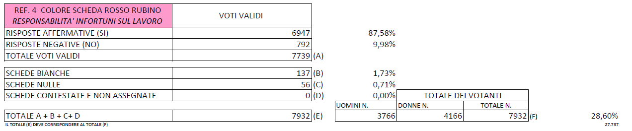 «Volete voi l’abrogazione dell’art. 26, comma 4, del decreto legislativo 9 aprile 2008, n. 81, recante “Attuazione dell’articolo 1 della legge 3 agosto 2007, n. 123, in materia di tutela della salute e della sicurezza nei luoghi di lavoro” come modificato dall’art. 16 del decreto legislativo 3 agosto 2009 n. 106, dall’art. 32 del decreto legge 21 giugno 2013, n. 69, convertito con modifiche dalla legge 9 agosto 2013, n. 98, nonché dall’art. 13 del decreto legge 21 ottobre 2021, n. 146, convertito con modifiche dalla legge 17 dicembre 2021, n. 215, limitatamente alle parole “Le disposizioni del presente comma non si applicano ai danni conseguenza dei rischi specifici propri dell’attività delle imprese appaltatrici o subappaltatrici.”?»