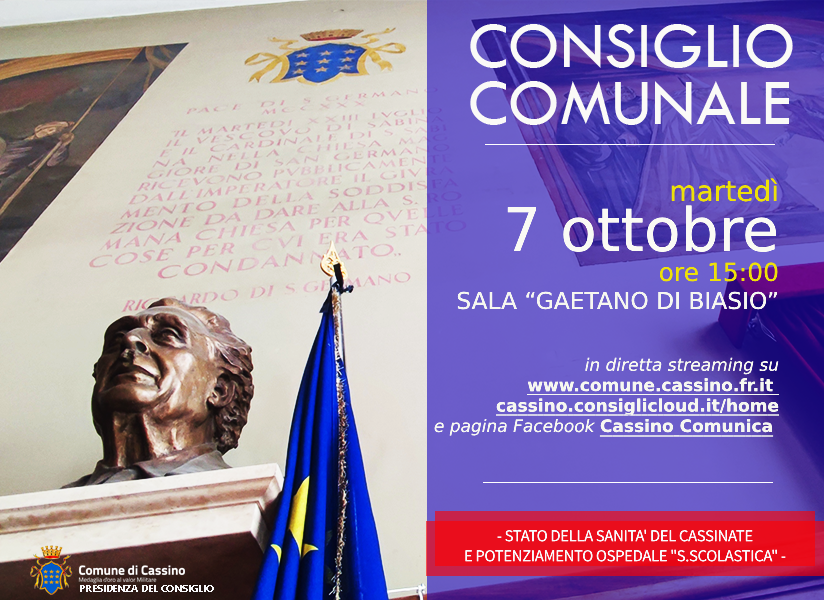 É stata convocata, per oggi, martedì 7 ottobre, a partire dalle ore 15, la seduta straordinaria aperta del Consiglio Comunale di Cassino.