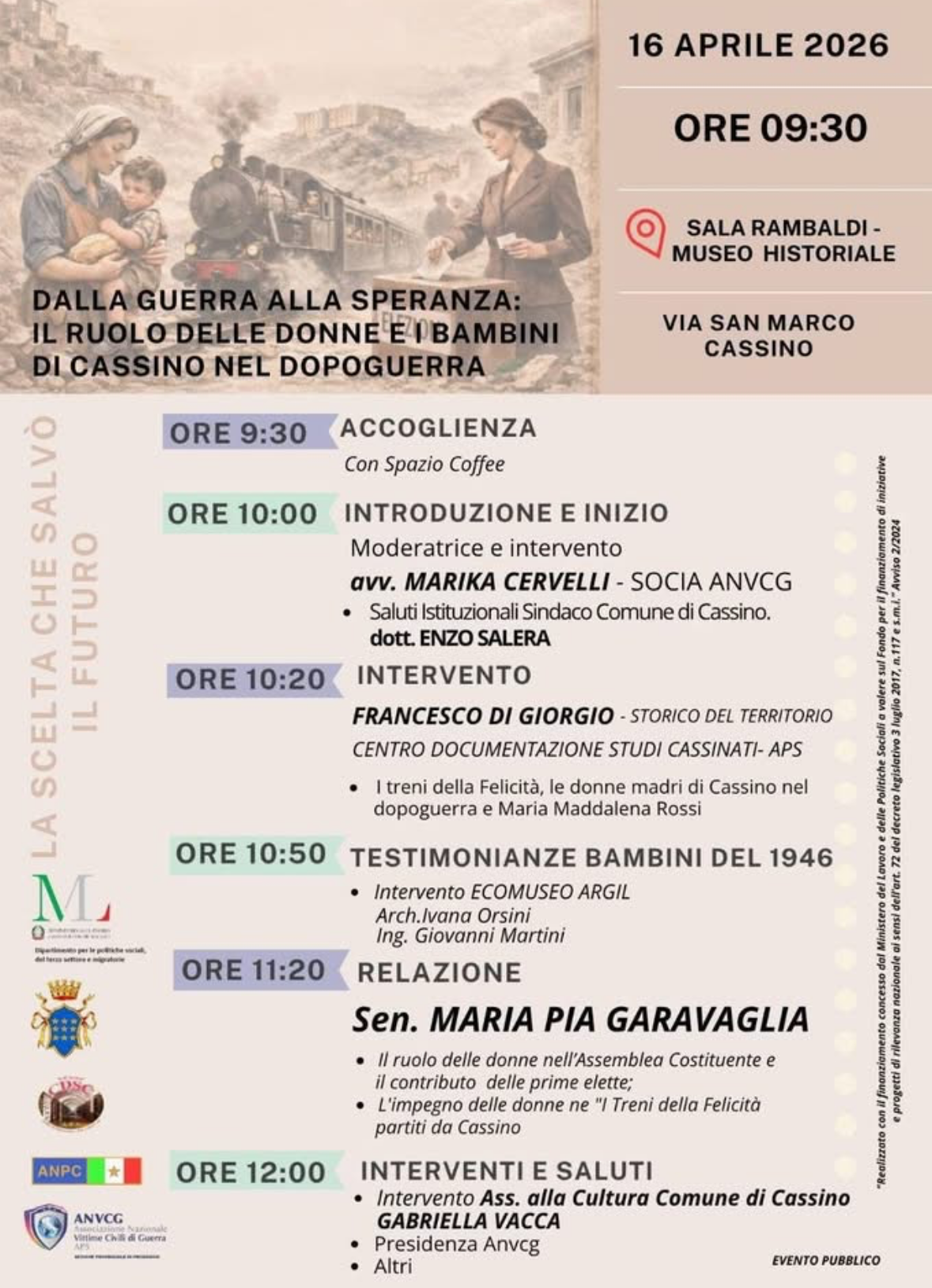 L'iniziativa, inserita nel progetto "La scelta che salvò il futuro", approfondirà pagine cruciali della nostra storia locale, con un focus particolare sui "Treni della Felicità" e sull'impegno civile femminile nella ricostruzione. Ci sarà la presenza del dott. Enzo Salera e dell' Ass. alla cultura Gabriella Vacca.