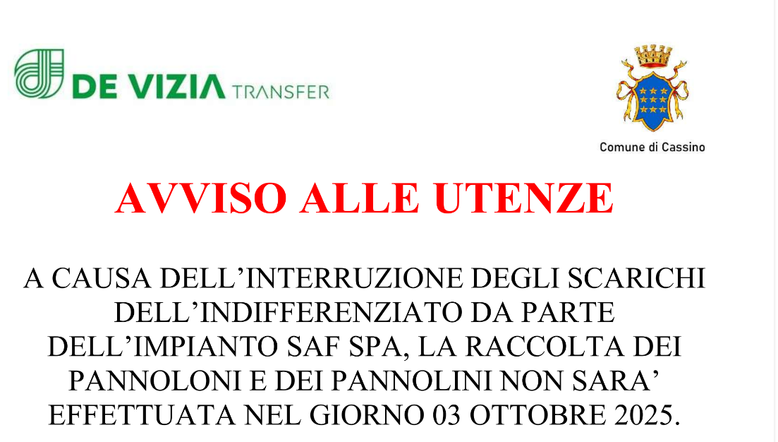 La De Vizia Spa, comunica all'utenza che a causa dell’interruzione degli scarichi dell’indifferenziato da parte dell’impianto Saf spa, la raccolta dei pannoloni e dei pannolini non sara’ effettuata domani, venerdì 3 ottobre 2025.