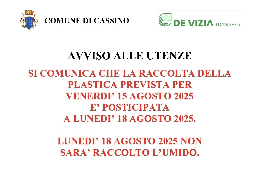 Nello specifico, venerdì 15 agosto non verrà effettuata la raccolta della plastica, posticipata al giorno lunedì 18 agosto.