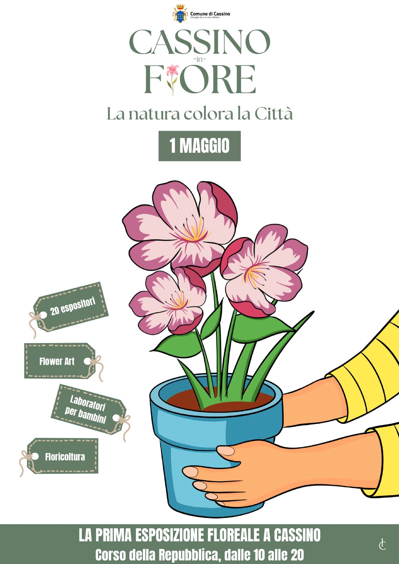 Giovedì 1 maggio, dalle ore 10 alle 20, l’area pedonale di Corso della Repubblica si trasformerà in un grande e coloratissimo giardino a cielo aperto. Un vero e proprio percorso – ad ingresso gratuito - dove passeggiare e divertirsi, ma anche imparare a gestire e a “giocare” con i fiori e le piante dei tanti espositori presenti, di Cassino e del cassinate.