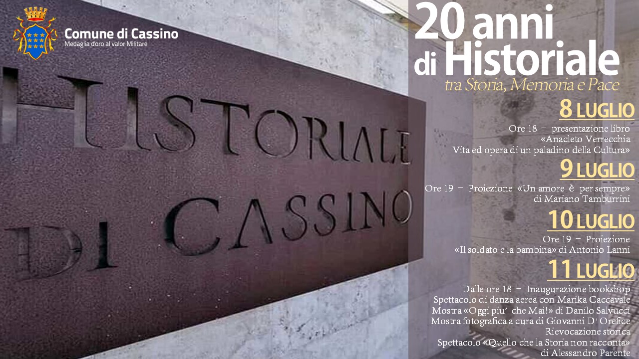 Dall'8 all'11 luglio la Città di Cassino celebra i 20 anni di Historiale con un programma speciale di eventi, incontri, proiezioni, mostre e spettacoli.