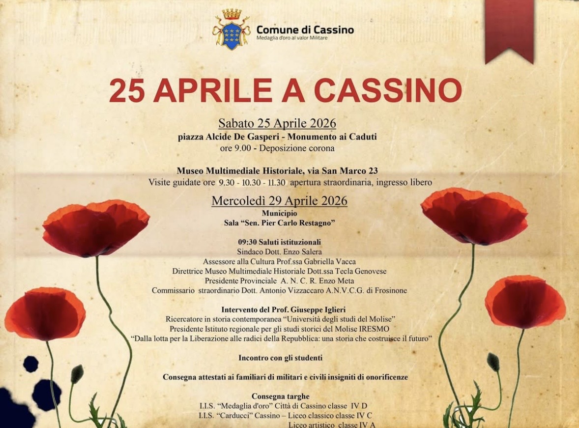 Nell’ambito delle celebrazioni per la Liberazione, la città di Cassino dedica la giornata di mercoledì 29 aprile 2026 ad un importante momento di riflessione storica e istituzionale presso la Sala "Sen. Pier Carlo Restagno" del Comune.