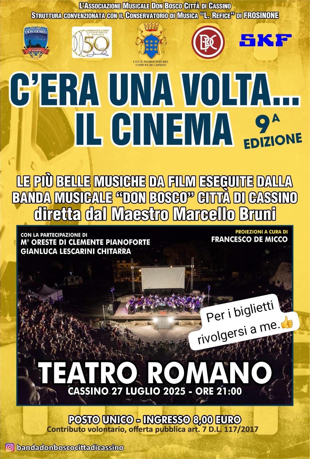 Con "C'era una volta il Cinema", kermesse giunta alla sua nona edizione, la Banda Don Bosco - Città di Cassino punta a stupire chiunque, con uno spettacolo imperdibile, in un'atmosfera unica come solo quella del Teatro Romano può regalare.