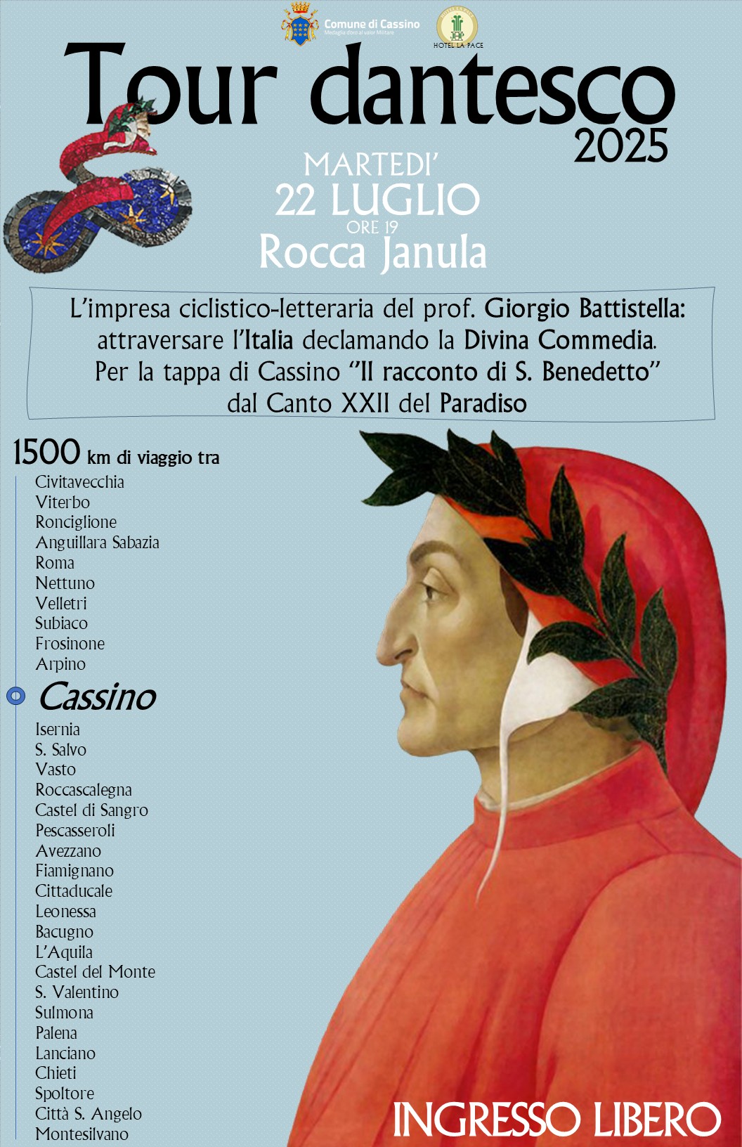 Martedì 22 luglio alle ore 19, alla Rocca Janula, un evento senza precedenti per la Città: l'impresa ciclistico-letteraria del prof. Giorgio Battistella che da anni attraversa in bici l'Italia, da Nord a Sud, da Est a Ovest, per decantare i versi della Divina Commedia, arriva finalmente a Cassino!
