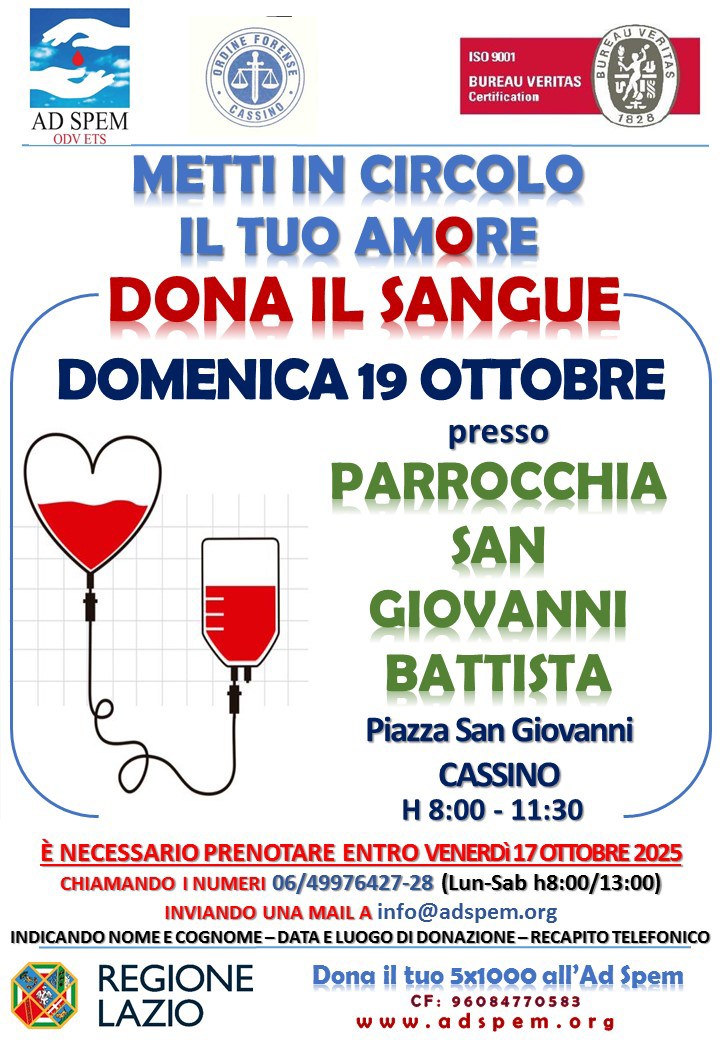 Domenica 19 ottobre, presso la locale parrocchia di S. Giovanni, una importante iniziativa per la donazione del sangue.