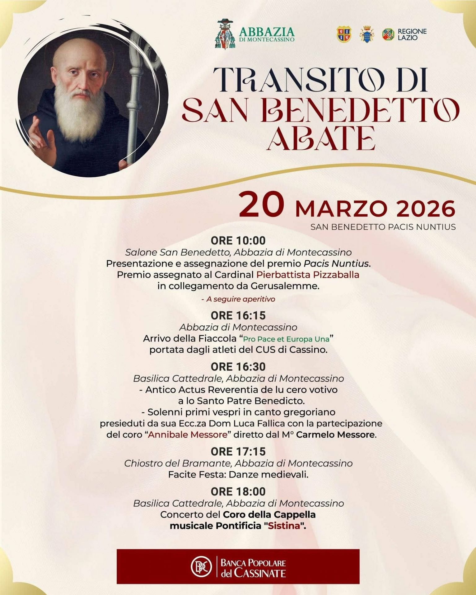 Proseguono a Cassino e a Montecassino le celebrazioni dei Giorni di San Benedetto, con una giornata ricca di appuntamenti spirituali e culturali dedicati alla figura del patrono d’Europa.