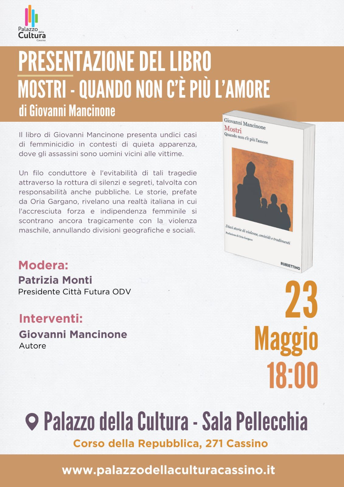 Presso il Palazzo della Cultura, nella sala Pellecchia, venerdì 23 maggio alle ore 18, la presentazione del libro "Mostri-Quando non c'è più l'amore" di Giovanni Mancinone.