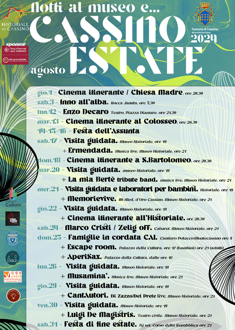 Un programma ricchissimo a Cassino per Ferragosto...ed oltre! Tantissimi eventi gratuiti con "CASSINO ESTATE-Notti al Museo e...": musica, laboratori, escursioni, ma anche cabaret, escape room, visite guidate, cinema. E molto altro ancora! A partire da questa sera, la rassegna dei principali eventi: