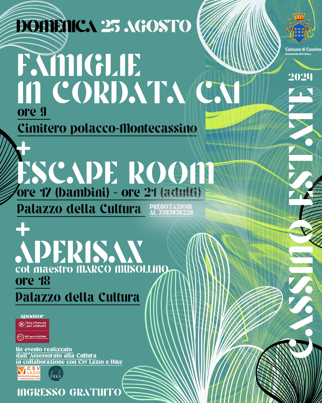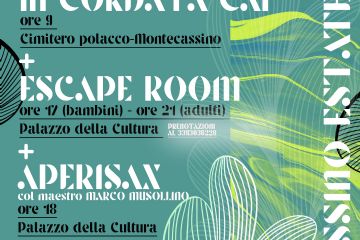 Un altro triplo evento da non perdere. Questa volta si parte di buon mattino, alle ore 9, dal Cimitero Polacco di Montecassino, assieme al CAI, per un evento imperdibile, tra natura e Storia! A seguire, nel Palazzo della Cultura, il divertentissimo e stimolante escape room: un evento aperto anche ai bambini. Per i più piccoli appuntamento alle ore 17, per gli adulti alle ore 21. Per prenotazioni, chiama il numero339036228. Nel mezzo, tra le due iniziative, lo spettacolare Aperisax, a partire dalle ore 18, con il Maestro Marco Musollino.