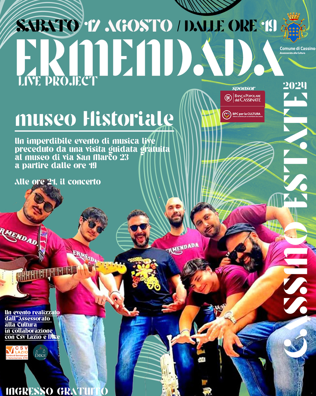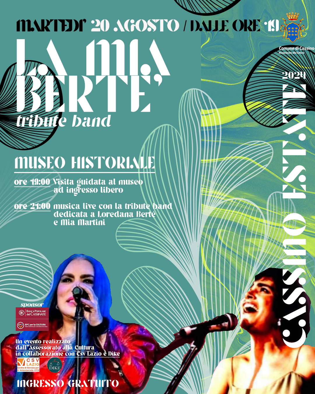 Come ormai di consueto in questa estate cassinate, alle ore 19, la visita guidata al museo Historiale e alle 21, il concerto live de La mia Berté: una band che propone i migliori brani del repertorio di Loredana Berté e Mia Martini. Uno spettacolo unico.
