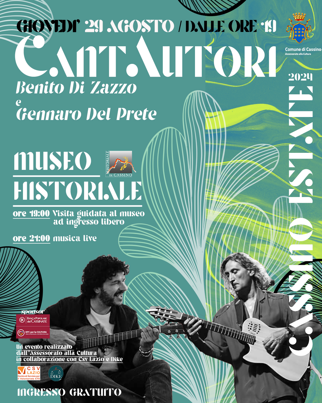 Benito Di Zazzo e Gennaro Del Prete, col progetto CantAutori, chiudono la serie di appuntamenti musicali dal vivo con un concerto speciale, sul palco del museo Historiale, alle ore 21. Come ormai d’abitudine, alle 19, in programma la visita guidata nel museo multimediale.