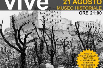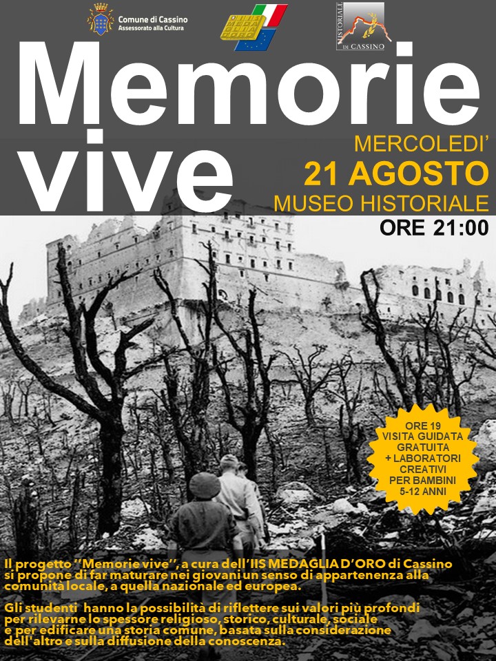 Il solito doppio appuntamento con la Cultura e l’Historiale, per il 21 agosto diventa addirittura triplo, con i laboratori per bambini! A partire dalle 19, la visita guidata, i laboratori e alle 21 l’evento MemorieVive, a cura dell’IIS Medaglia d’Oro di Cassino: un progetto che punta a far maturare nei giovani un senso di appartenenza alla comunità locale, a quella nazionale ed europea, riflettendo sui valori più profondi per rilevarne lo spessore religioso, storico, culturale, sociale e per edificare una storia comune.