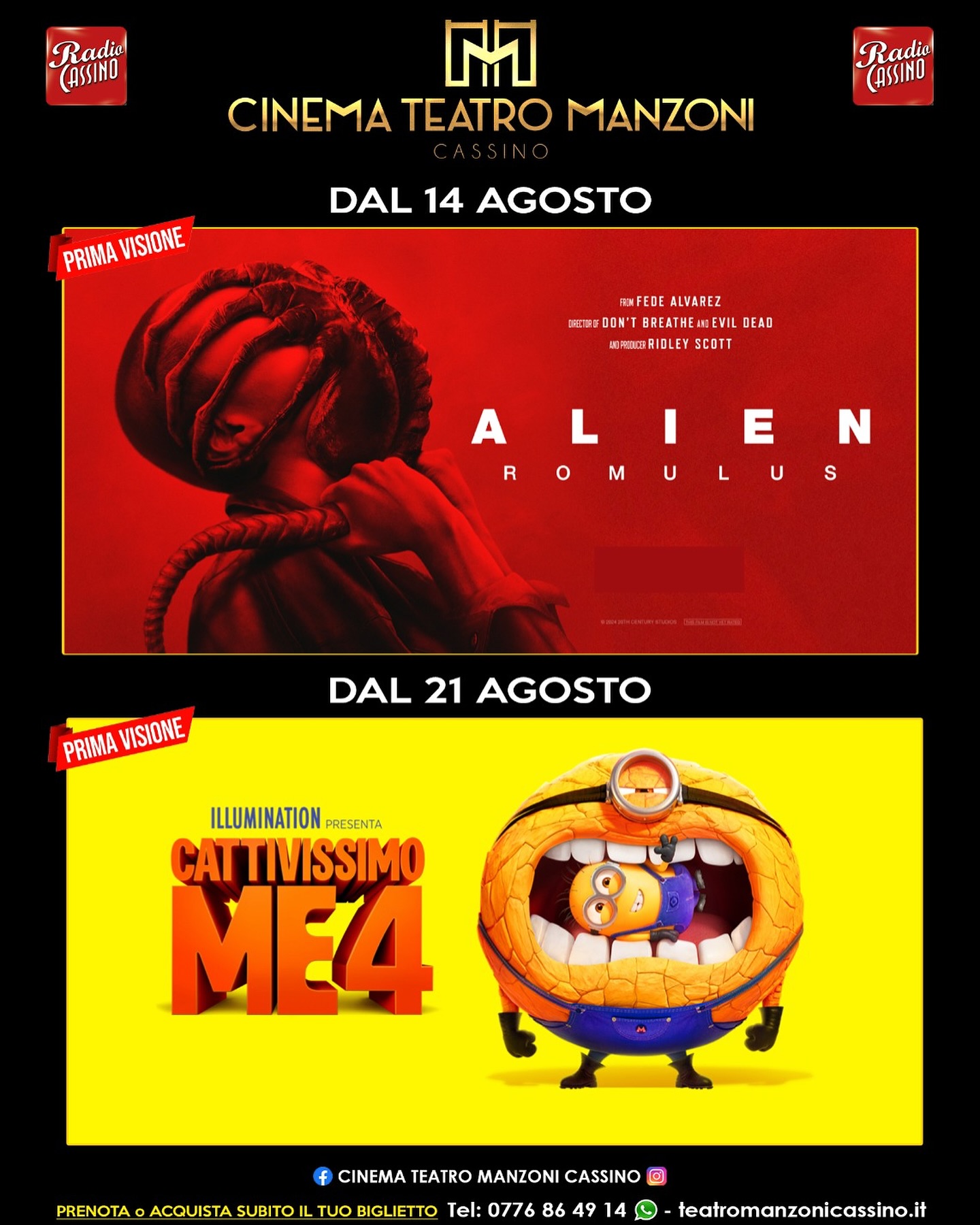 Settimana di imperdibili pellicole al Cinema Teatro Manzoni con Alien: Romulus dal 14 agosto e Cattivissimo Me dal 21. Per info, orari e biglietti, visita la pagina Cinema Teatro Manzoni Cassino