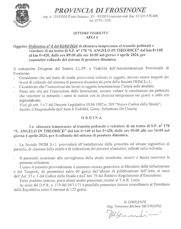 La provincia di Frosinone ha emesso una ordinanza di chiusura temporanea al transito di un tratto della strada provinciale "Sant'Angelo in Theodice", dal km 0+140 a km 0+420, dalle ore 9 alle ore 16 di domani, 4 aprile 2024.