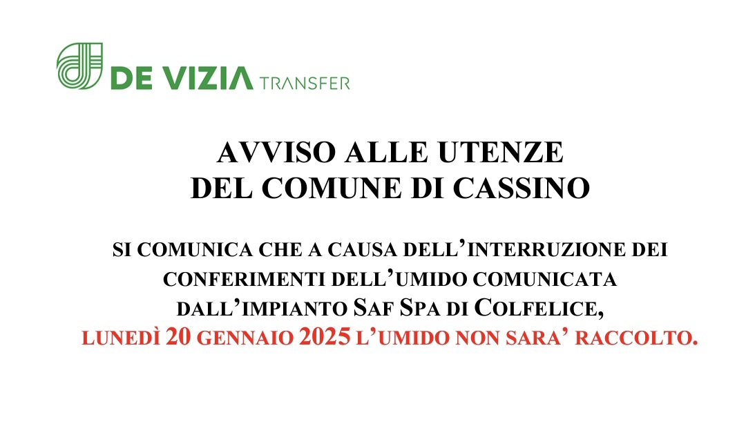 Il gestore della raccolta differenziata, De Vizia transfer, comunica che a causa dell’interruzione dei conferimenti dell’umido dall’impianto Saf spa di Colfelice, lunedì 20 gennaio 2025 la fraziome organica non sara’ raccolta.