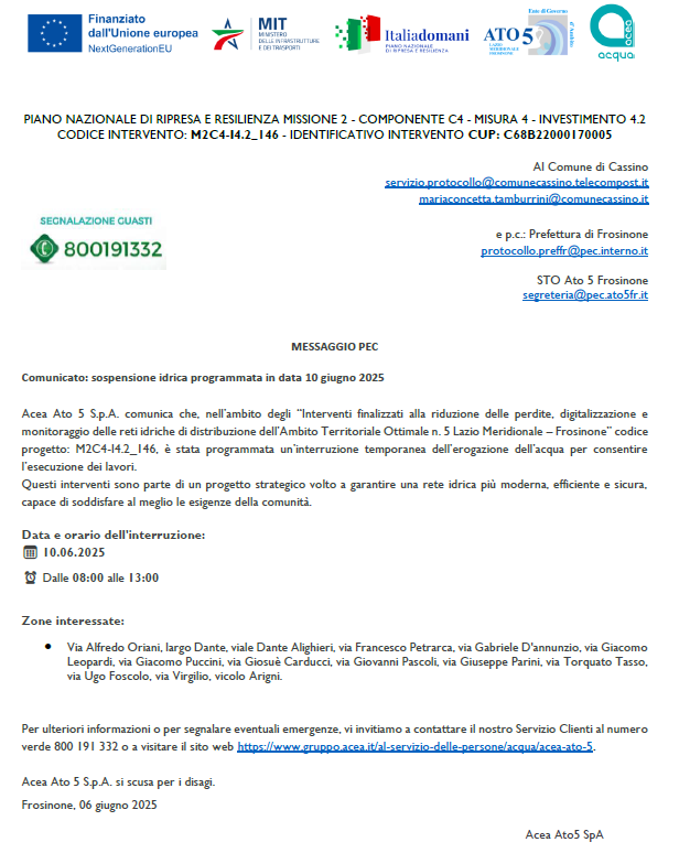 Acea Ato 5 informa che nell’ambito degli “Interventi finalizzati alla riduzione delle perdite, digitalizzazione e monitoraggio delle reti idriche di distribuzione dell’Ambito Territoriale Ottimale n. 5 Lazio Meridionale – Frosinone è stata programmata un’interruzione temporanea dell’erogazione dell’acqua per consentire l’esecuzione dei lavori".