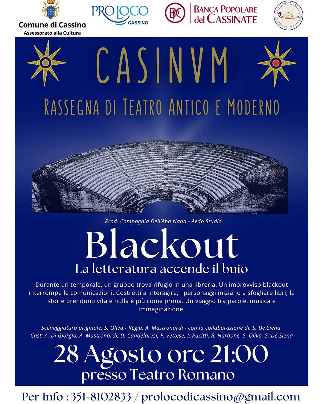 Giovedì 28 agosto arriva al Teatro Romano di Cassino, Blackout, il secondo appuntamento della rassegna “CASINVM – Teatro Antico e Moderno”: un ciclo di spettacoli teatrali a cura dell’Associazione Pro Loco, realizzati in collaborazione con l’Assessorato alla Cultura del Comune di Cassino e con il sostegno della Banca Popolare del Cassinate.